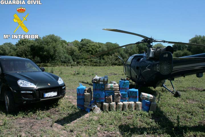 La Guardia Civil de Cádiz ha interceptado en La Janda (Cádiz) un alijo de droga que pretendía ser introducido a bordo de un helicóptero, habiendo incautado en total 700 kilogramos de hachís de gran pureza, la aeronave y dos vehículos, entre ellos un Porsche Cayenne.