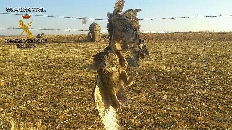 La Guardia Civil del Puesto de San Martín de Montalbán ha rescatado a un búho real que se encontraba atrapado, y aún con vida, en una alambrada metálica dentro del término municipal de la misma localidad. Sobre las 08’10 horas de la mañana del día 30 de julio, los componentes de una patrulla de la Guardia Civil de San Martín de Montalbán, que prestaban servicio recibieron el aviso de un ciudadano que les alertó de la existencia de un ave enganchada a una valla metálica.