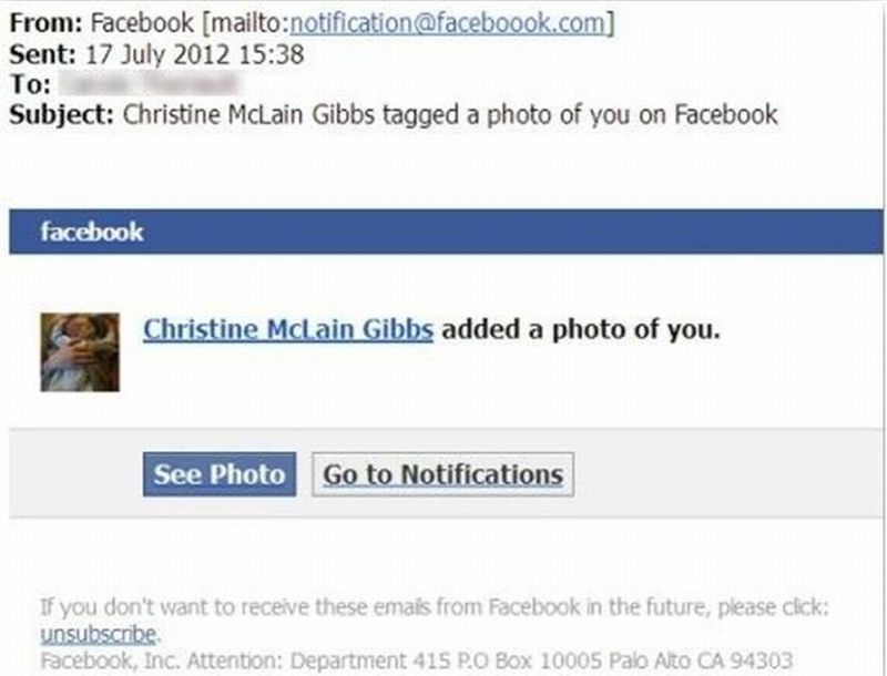 Este mail, muy similar a las verdaderas notificaciones de la red social, asegura que el usuario ha sido etiquetado en una nueva fotografía. Al tener prácticamente la misma apariencia, el usurario no repara en ciertos detalles, como por ejemplo que en la dirección de correo de donde procede el mail la palabra Facebook está escrita con tres oes en lugar de dos.