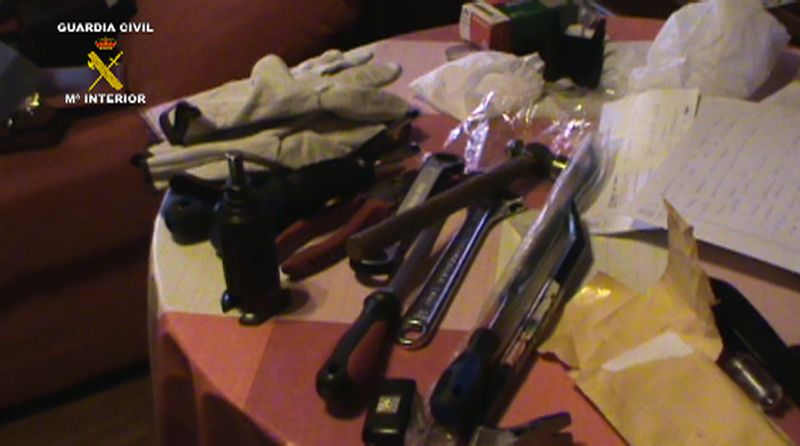 Los agentes hallaron en los domicilios numerosos objetos cuya procedencia no pudieron justificar (efectos de cosmética, relojes, zapatillas, prendas de vestir), diversas herramientas que utilizaban en sus robos entre las que destacan dos radiales, un hacha, un pico y una maleta con bombonas combinadas de oxígeno y acetileno enganchadas a un soplete, que utilizaban para la apertura de las cajas fuertes.