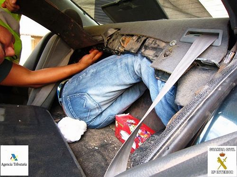 Los guardias civiles detectaron que la longitud del maletero era sensiblemente inferior a los de esta marca y modelo lo que les llevó a realizar una inspección más exhaustiva que concluyó con la localización de una persona en un doble fondo practicado bajo los asientos traseros y el maletero.