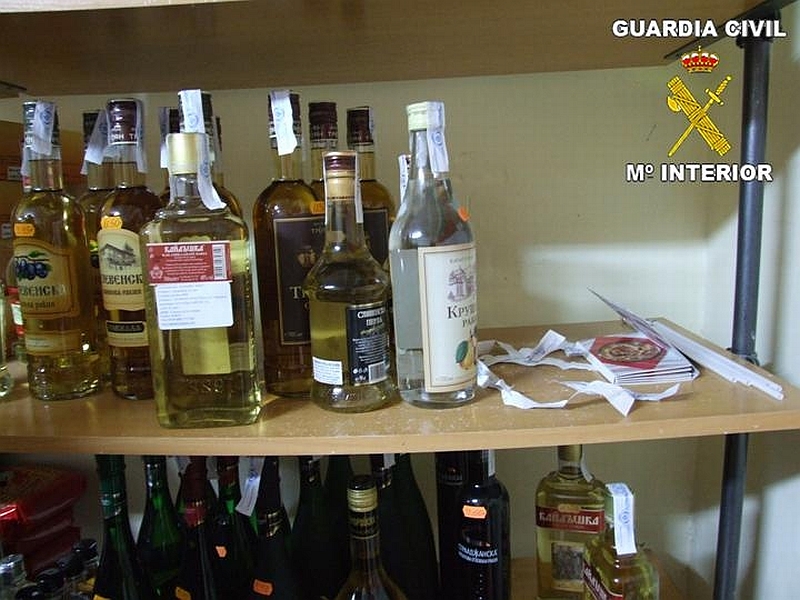 Por tales motivos, el pasado día 8 de marzo, se realizó un registro en dicho establecimiento en el que se intervinieron 63 botellas de bebidas alcohólicas de alta graduación, superior a 38º (vodkas y aguardientes de distintas frutas), en botellas comerciales en idioma búlgaro. Todas ellas con aparentes signos de tener falsificadas o manipuladas las preceptivas precintas de impuestos especiales.