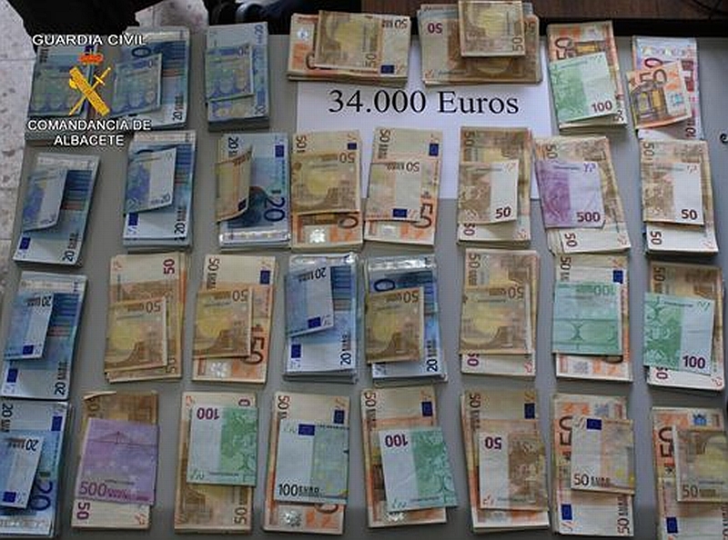 Este dinero, que alcanzó un importe de 34.000 euros tras ser contabilizado, fue intervenido por la Guardia Civil dado que el detenido no pudo acreditar su legal procedencia.