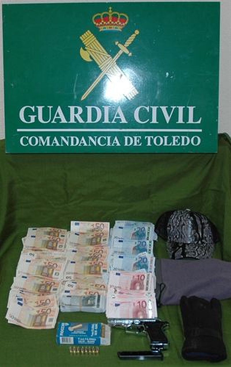 El arma empleada en el atraco resultó ser una pistola detonadora y fue intervenida por la Guardia Civil en el registro realizado en el domicilio del último detenido, donde también fueron intervenidos 15 cartuchos detonantes.