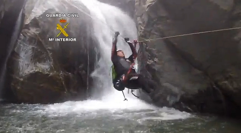 Un grupo de socorristas del Sereim fue trasladado al lugar por un helicóptero de la Guardia Civil, que los dejó en la parte del cauce del río más cercana posible a la posición de los atrapados, desde donde montaron tirolinas para salvar tres grandes saltos de agua y de este modo remontar río arriba hasta un punto donde pudieran ser recogidos por el transporte aéreo.