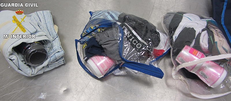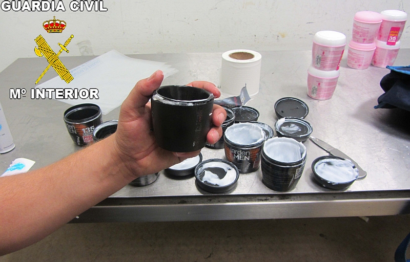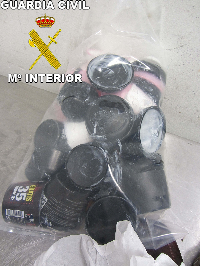 La última intervención se realizaba por la tarde del mismo día, en esta ocasión resultó detenido un ciudadano colombiano, a quien la Guardia Civil localizó en su equipaje catorce botes de crema cosmética para hombre, a los que se les había practicado un doble fondo y que contenían 1.050 gramos de cocaína.