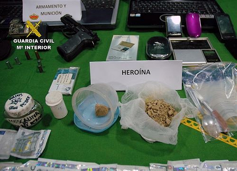 La Benemérita ha realizado cuatro registros y ha detenido a uno de los integrantes de la organización criminal, ha interviniendo unas 3.200 dosis de heroína, una importante cantidad de billetes y monedas procedentes del tráfico de droga, un arma detonadora y diversa munición real.
