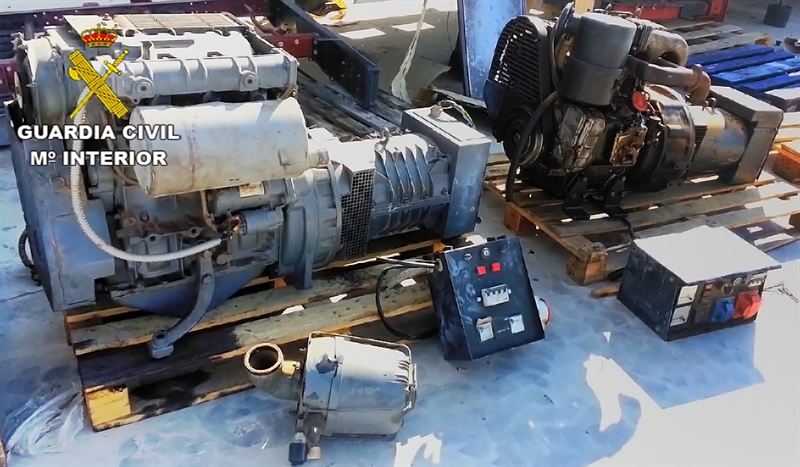 La Guardia Civil ha recuperado seis motores de riego, tres motobombas, cuatro generadores eléctricos, tres transformadores eléctricos de alta tensión así como cuadros eléctricos, baterías, focos halógenos, alargaderas, máquinas de soldar y casi 200 litros de gasóleo.