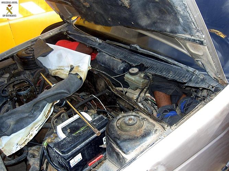 Tras la apertura del capó, se ha hallado en primer lugar a una persona "enclaustrada entre el salpicadero y el habitáculo del motor", que fue auxiliada a salir de tan infrahumano lugar. Para realizar ese doble fondo habían retirado previamente "el motor de refrigeración interior, todo su cableado y los tubos de reparto del aire" y habían soldado una chapa al chasis del turismo, para soportar el peso de la persona allí localizada.