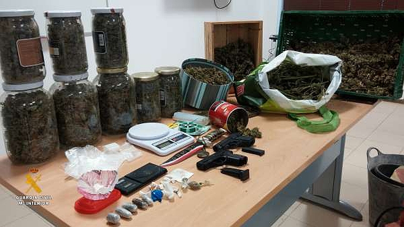 También en una habitación de la vivienda, en el fondo de un remolque lleno de arena y en dos depósitos de agua se hallaron mas marihuana, Speed, hachís, dos armas simuladas y documentación, así como diversos efectos para pesar y distribuir las dosis de droga.
