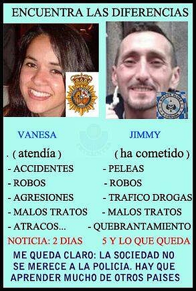 Lamentablemente para nuestros políticos y para los medios no valen lo mismo, mientras que la muerte de Vanesa es incómoda para nuestros políticos y resalta un problema de dotación a las FCSE, la de Jimmy les viene como anillo al dedo, porque desvía la atención de otros muchos problemas y carencias que si son culpa de los políticos. Por esa razón, a fecha de hoy, aún es noticia y de aquí nuestro enfado y la publicación de la comparativa.
