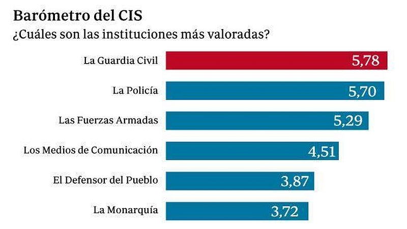 La Guardia Civil es la institución que merece más confianza para los ciudadanos españoles: un 5,78 (en una escala de 0 a 10), según el último Barómetro del CIS, correspondiente al mes de abril. Muy cerca se sitúa la Policía, con un 5,70. Por encima del cinco también están las Fuerzas Armadas, con un 5,29. [Consulta completo el barómetro del CIS de abril (PDF)]