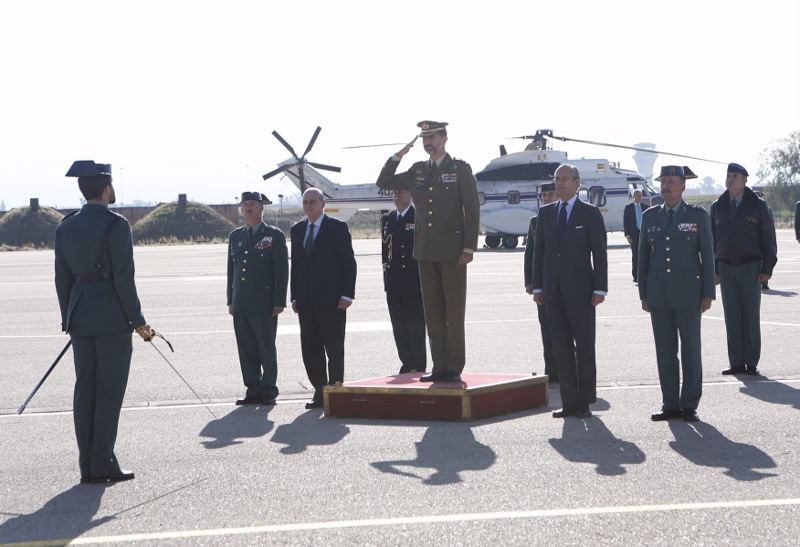 El Rey ha podido conocer los medios y capacidades con que cuenta el Servicio Aéreo de la Guardia Civil, así como asistir a un simulacro de misión a bordo de un avión CN-235, enlazando con un avión del Cuerpo desplegado en Sigonella (Italia) en la operación Hermes de FRONTEX