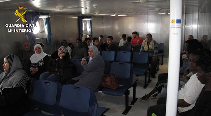 Las embarcaciones auxiliares embarcaron a otras 35 personas, todas ellas mayores de edad y varones, lo que hace un total de 370 inmigrantes transportados. A los inmigrantes rescatados se les facilita agua y alimentos, acomodando en la cubierta de vuelo a los varones mayores y en la sala de náufragos a las mujeres y a los menores.