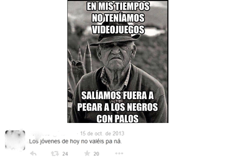 Tras la leyenda "EN MIS TIEMPOS NO TENÍAMOS VIDEOJUEGOS. SALÍAMOS FUERA A PEGAR A LOS NEGROS CON PALOS", se observa la fotografía de una persona de la tercera edad, con el comentario "Los jóvenes de hoy no valéis pa ná".