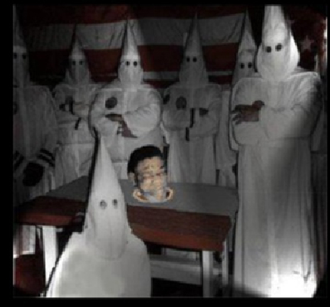 Se observa a un grupo de encapuchados, supuestamente pertenecientes al Ku Klux Klan, de pie alrededor de una mesa, donde se escenifica la presencia de una cabeza de una persona de raza negra, habiendo realizado el usuario investigado el comentario "Aquí, con mis compis del paso blanco. ¡VIVA LA SEMANA SANTA DE MURCIA!".