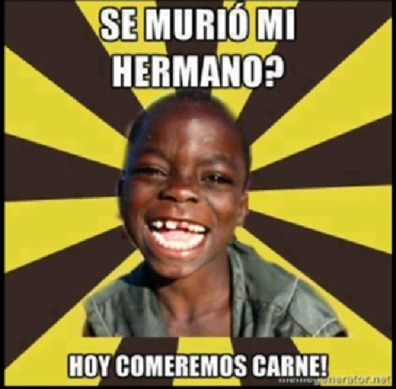 Consistente en la imagen de un niño de raza negra sonriendo, y la leyenda "SE MURIO MI HERMANO? HOY COMEMOS CARNE!", habiendo sido marcada la publicación como favorita por 10 usuarios y retuiteada por 7.