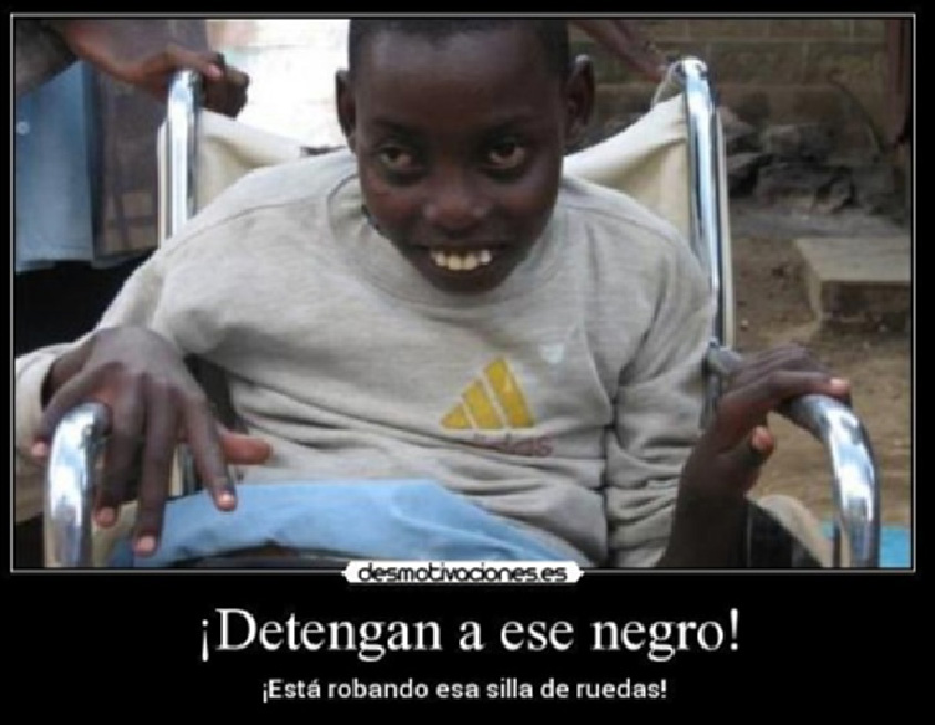 Se observa la imagen de un niño de raza negra, con algún tipo de discapacidad psíquica o física, en una silla de ruedas y la leyenda "¡Detengan a ese negro!. ¡Está robando esa silla de ruedas!", habiendo sido marcado como favorito por 9 usuarios y retuiteado por otros 9.