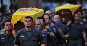 Fueron dos piquetes del instituto armado, entre ellos compañeros de Galera y Bravo, y uno del Ejército los que portaron, también entre lágrimas, los tres féretros cubiertos por la bandera española mientras sonaba la marcha fúnebre.