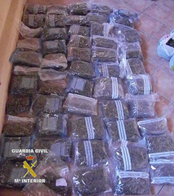 Una vez detenidos y tras el registro domiciliario practicado, con el oportuno Mandamiento Judicial, se intervinieron 46 kilos de cogollos de marihuana, perfectamente envasado en bolsas de 260 gramos y preparados para su posterior distribución y venta, así como otros 100 kilos más de plantas de marihuana.