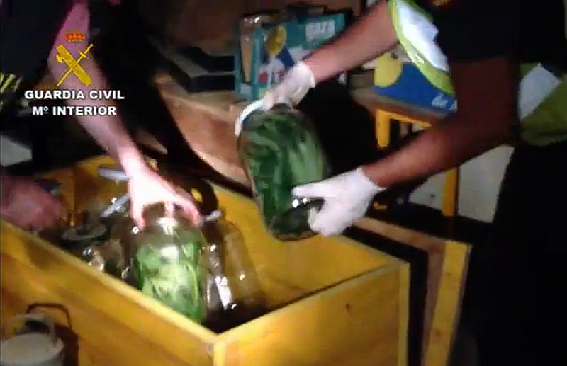 Una vez dentro se procedió a su detención y se intervino una plantación de con un peso de unos 240 kilos, así como utensilios, recipientes y diferentes objetos relacionados con el cultivo y elaboración de esta droga.