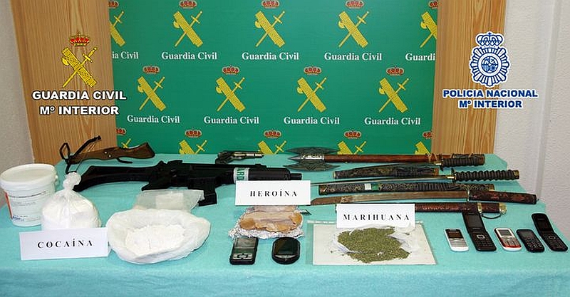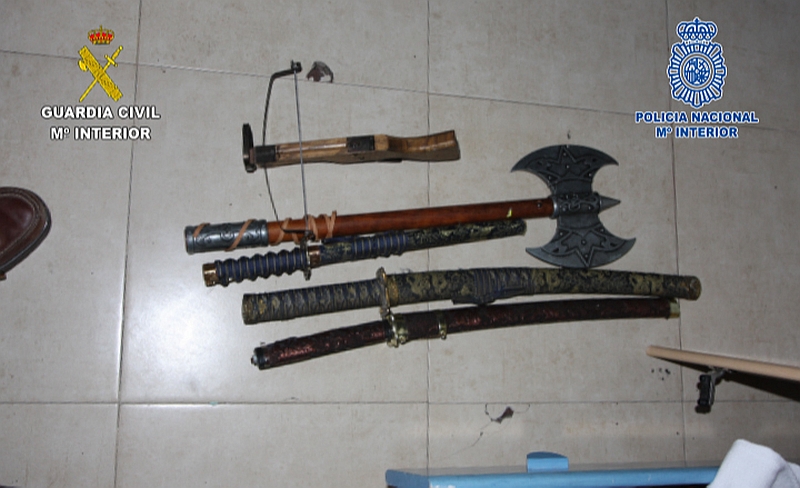 Durante los registros se ha procedido a la detención de J.P.M., R.B.M., D.C.G., y C.F.F., dos hombres y dos mujeres de entre 31 y 40 años, como presuntos autores de un delito de tráfico de drogas. Además se han incautado 300 gramos de heroína dispuesta para su inminente distribución, un kilo de cocaína, 60 gramos de marihuana, un kilo de sustancia de corte, balanzas de precisión, dos turismos de gama alta supuestamente empleados por los detenidos para sus actividades delictivas; y varias armas: una imitación de fúsil de asalto de aíre comprimido, una pistola de aíre comprimido, tres katanas japonesas, un hacha de doble hoja y una ballesta artesanal.