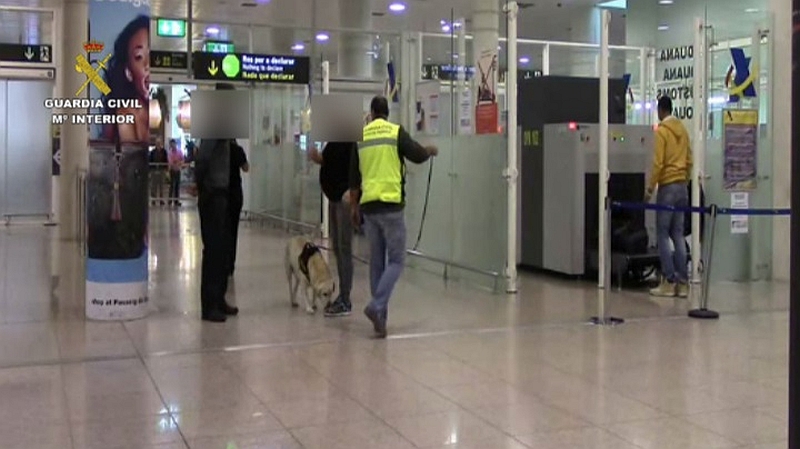 La droga fue detectada cuando efectivos del Servicio Cinológico de la Guardia Civil prestaban servicio el pasado domingo en el vestíbulo aduanero de la T-1 del aeropuerto del Prat, controlando la llegada de varios vuelos, en coordinación con efectivos del Servicio Fiscal de la Guardia Civil.