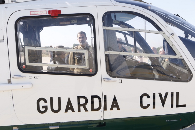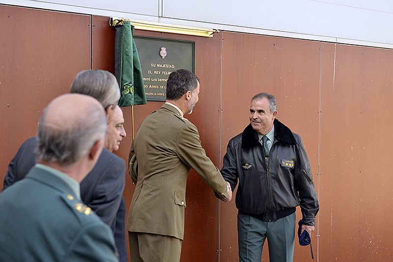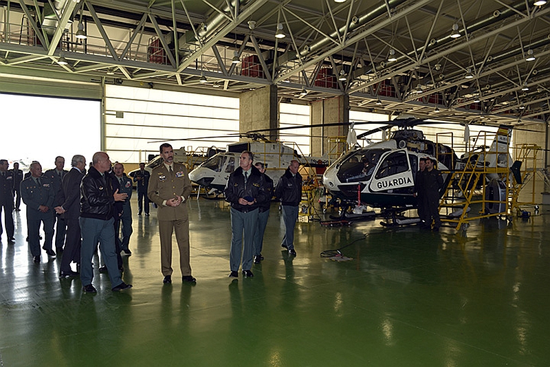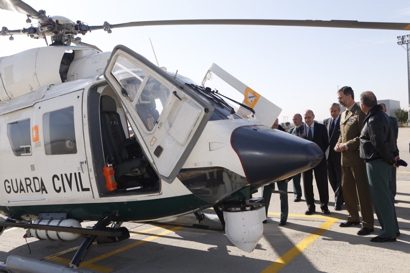 El Rey ha podido conocer los medios y capacidades con que cuenta el Servicio Aéreo de la Guardia Civil, así como asistir a un simulacro de misión a bordo de un avión CN-235, enlazando con un avión del Cuerpo desplegado en Sigonella (Italia) en la operación Hermes de FRONTEX
