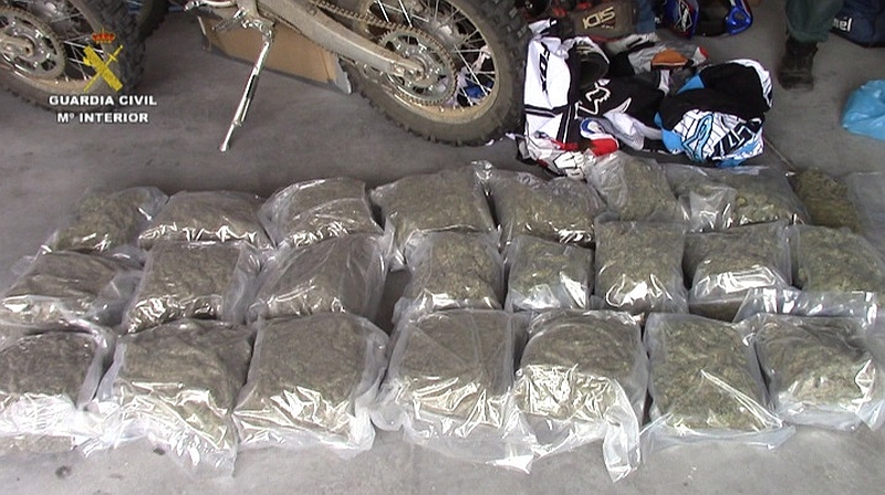 En los registros practicados se han intervenido, 100 kilos de marihuana distribuidos en cajas y bolsas de diferente tamaño, útiles de pesaje y embalaje de sustancia estupefaciente, dos armas de fuego, 20.000 euros en billetes pequeños, así como diversos objetos de la organización HELL´S ANGELS como indumentaria representativa de la organización, parches, cuadros, fotos, etc.