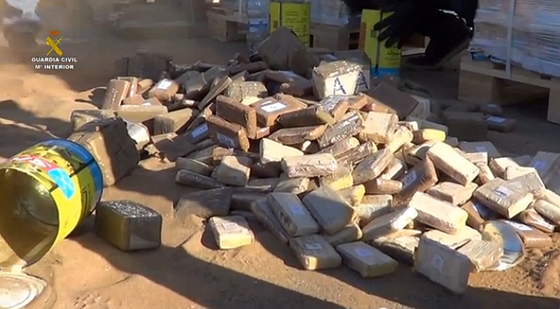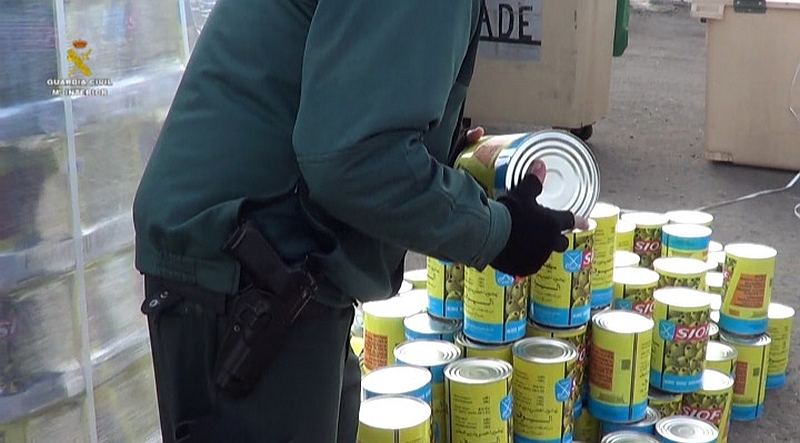 Tras haber dado positivo en sustancias estupefacientes por parte de dos de los canes en las latas de aceitunas, se procedió a la apertura de las mismas, hallando un total de 1.040 kilogramos de hachís ocultos en su interior.