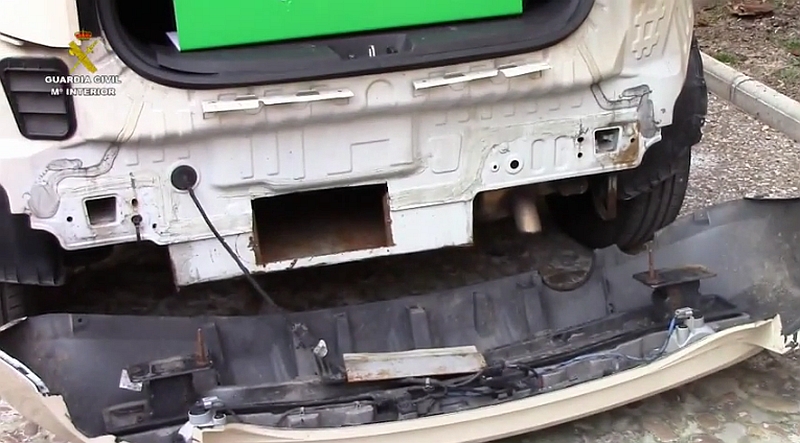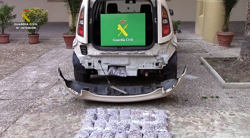En el minucioso registro y tras desmontar los paragolpes, los agentes hallaron ocultas en los mismos, bolsas de plástico que contenían bellotas de hachís con un peso total de 38.270 gramos, de las que se obtendrían 153.000 dosis.