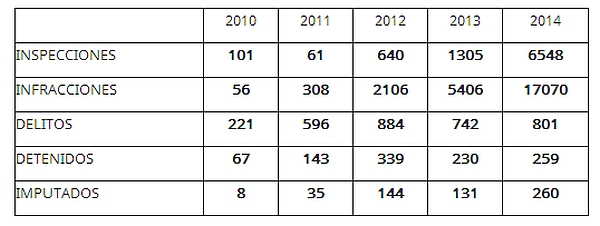 En el siguiente cuadro se puede apreciar el incremento de infracciones, inspecciones, delitos y detenidos en los últimos años en el ámbito de la investigación de la actividad de los talleres mecánicos ilegales: