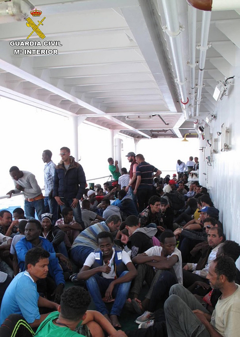 Las embarcaciones auxiliares embarcaron a otras 35 personas, todas ellas mayores de edad y varones, lo que hace un total de 370 inmigrantes transportados. A los inmigrantes rescatados se les facilita agua y alimentos, acomodando en la cubierta de vuelo a los varones mayores y en la sala de náufragos a las mujeres y a los menores.