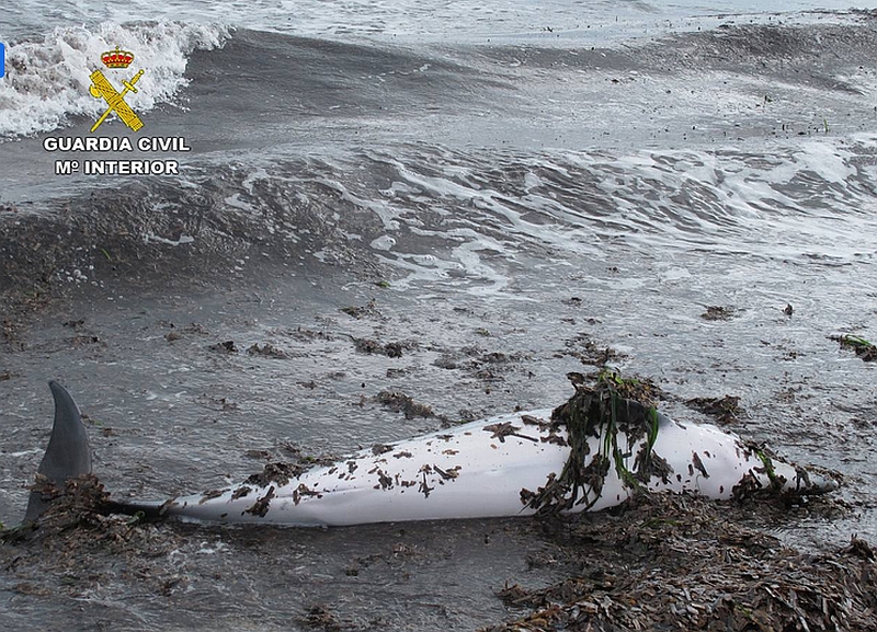 El pasado domingo, día 8, la Guardia Civil fue alertada del hallazgo de un cetáceo que se encontraba varado en la orilla de la playa Ensenada del Esparto, de La Manga del Mar Menor, por lo que de inmediato se activaron las patrullas con la finalidad de localizar al animal.