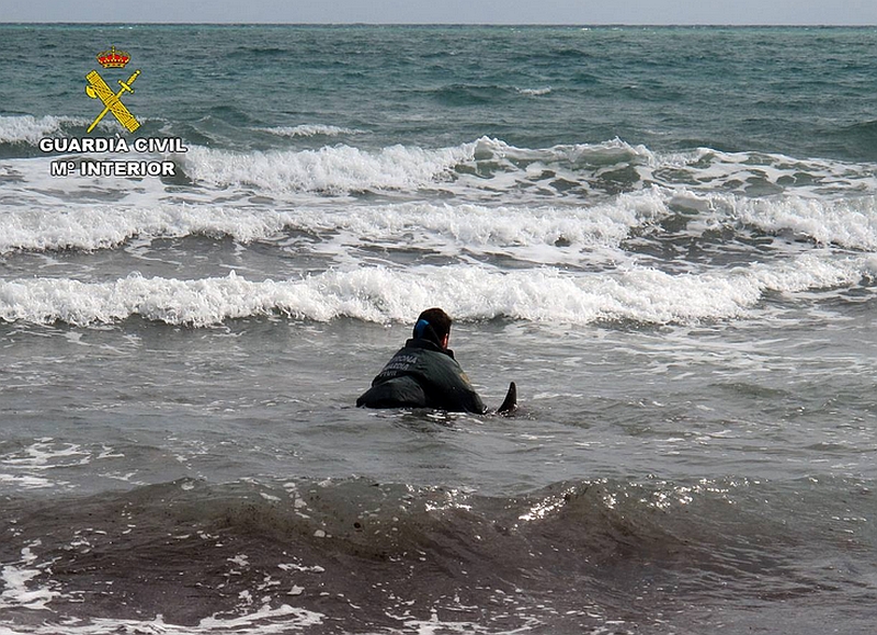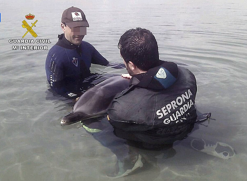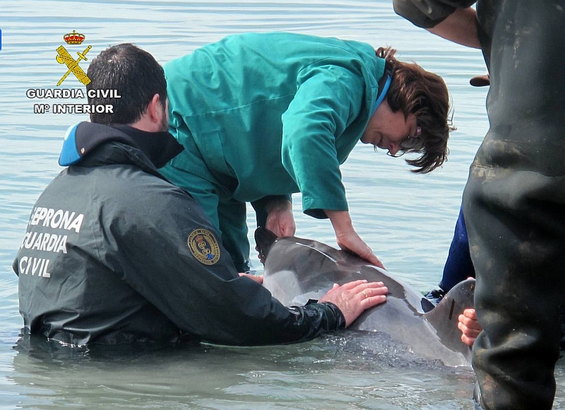 Poco después, especialistas del Servicio de Protección de la Naturaleza (Seprona) se desplazaron hasta el lugar del aviso y observaron la presencia de un ejemplar de delfín listado, que se encontraba exhausto y sin recursos para regresar al mar.