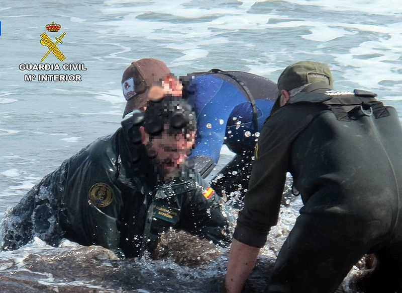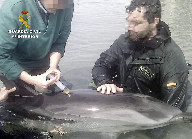 Con el fin de mantenerlo con vida, uno de los guardias civiles se introdujo en el mar para proceder a su auxilio inmediato, por una parte introduciendo al animal en el mar mientras lo sujetaba para mantenerlo a flote, procurando, a su vez, que su estado de hidratación no disminuyese.