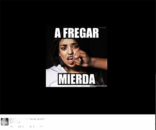 Se puede observar a una mujer arrinconada en el suelo, tapándose la cabeza atemorizada, y el puño de un hombre amenazante en primer plano, habiendo realizado el usuario el comentario "Tío, tú sabes que la quieres. En cuanto la veas, demuéstraselo así".