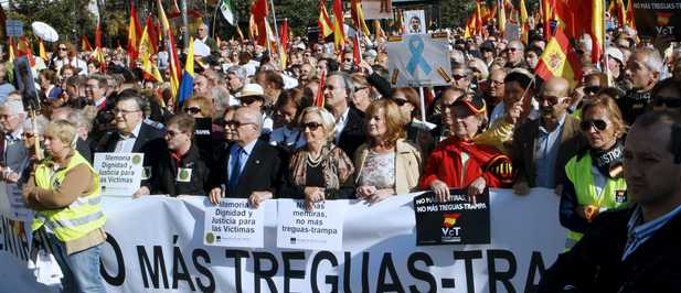 Bajo el lema 'No más mentiras. No más treguas trampa', víctimas del terrorismo se congregaron este mediodía en la madrileña Plaza de Colón, en una concentración convocada por la asociación Voces Contra el Terrorismo, que actualmente preside Francisco José Alcaraz.